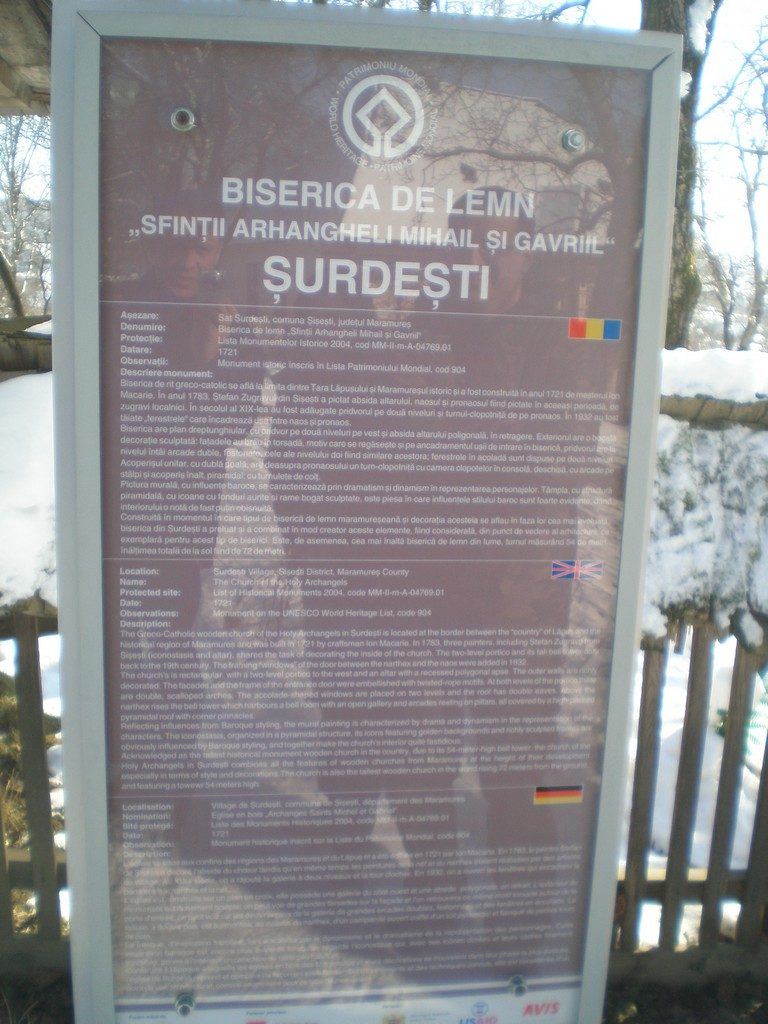 BISERICA DE LEMN DIN SURDESTI aflata pe lista Unesco, este cea mai inalta biserica de lemn din Romania si probabil si din lume, avand o inaltime de 72 de metri. A fost construita in jurul anilor 1700 si se deosebeste de celelalte bisericute de lemn prin pridvorul dublu de la intrare ce are traforat in peretii gardului o inima intoarsa.