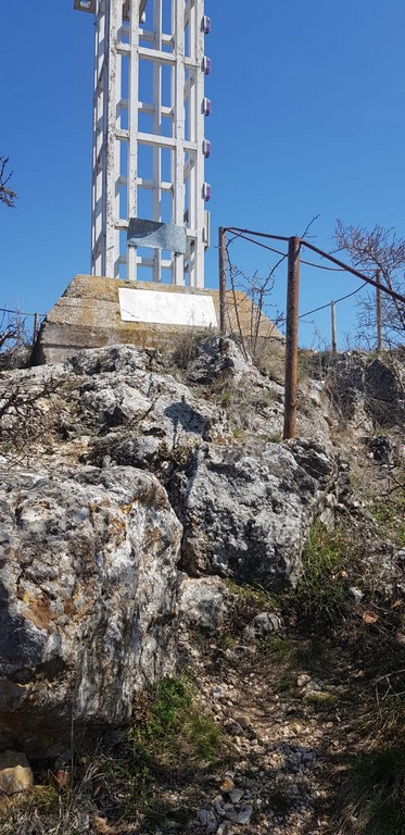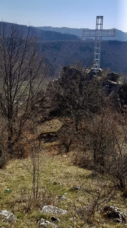 Citisem inainte de a pleca de acasa, ca exista o poteca ce porneste de la biserica din sat si ajunge prin padure pana sus la cruce. Am intrat in curtea bisericii dar nu am gasit un drum care sa duca spre padure. Am intrebat apoi un localnic, care ne-a aratat ca se face un drum pe langa a patra casa de la biserica, un drum care era inchis cu o poarta de tabla. Ciudat. Poarta era deschisa, am intrat, am trecut pe langa o mini ferma si am data poi intr-o poteca, dar care ne-a condus apoi spre stanga in lateralul masivului, pe cand noi trebuia sa urcam spre cruce. Ne-am intors si am luat-o direct prin padure spre cruce, fara sa vedem un traseu marcat sau macar o poteca. Pacat ca autoritatile din Stoenesti nu se ingrijesc de acest traseu. In plus, avand in vedere cat de frumoasa este zona, ar putea atrage o parte din turistii care vor sa evite aglomeratia de pe Valea Prahovei, dar pentru asta ar trebui sa faciliteze constructia pensiunilor agroturistice, sa creeze poteci de drumetie, trasee de biciclete, locuri amenajate cu masute, foisoare, gratare – asa cum am vazut in zona Pietrele lui Solomon din Brasov sau Lacul Paltinu de langa orasul Campina.