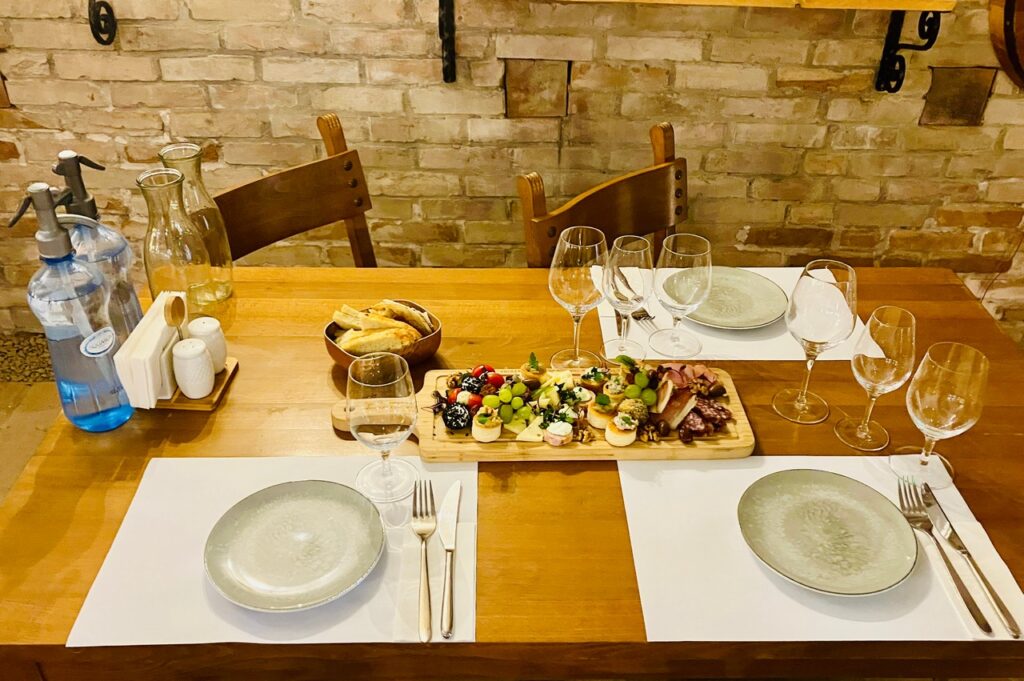 🍷 O Fetească Neagră (Dealu Mare, 2021, Domeniile Franco Române, 14.9% alcool) – singurul roșu din selecție, sec, nebaricat, cu arome proaspete de fructe de pădure. S-a asociat bine cu pieptul de rață și cu cârnații uscați de pe platou. Au ales să-l includă în gama lor de vinuri special pentru asocierile cu preparatele mai consistente și pentru turiștii străini care îl caută în mod special. O alegere bine gândită – vinurile bio ale DFR asemănându-se cu unele vinuri roșii produse în Transilvania.