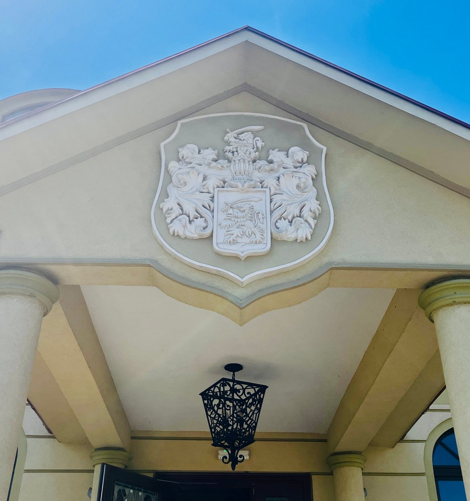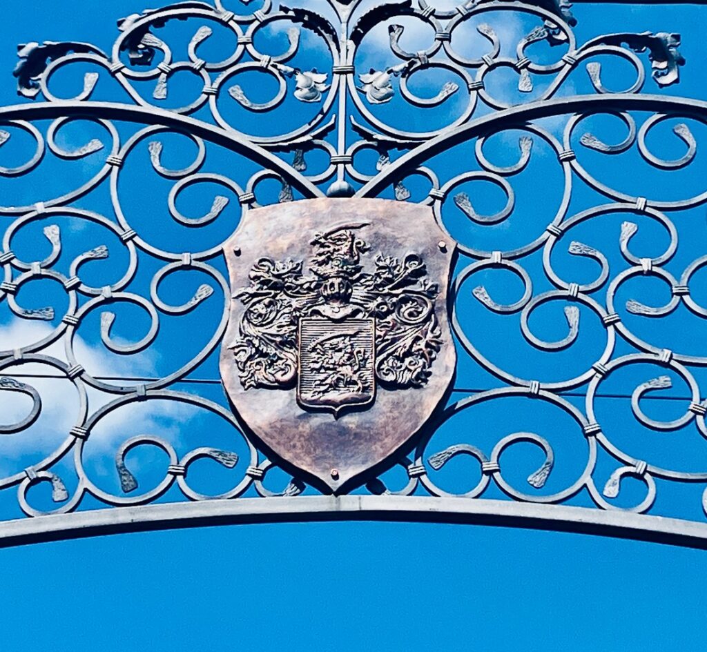 Încă de la intrarea pe domeniu, poarta de fier forjat cu motive de viță-de-vie și struguri ne-a pregătit pentru ceea ce urma. În centrul porții am văzut blazonul familiei Petry, pe care l-am întâlnit apoi în mai multe locuri de pe acest domeniu.